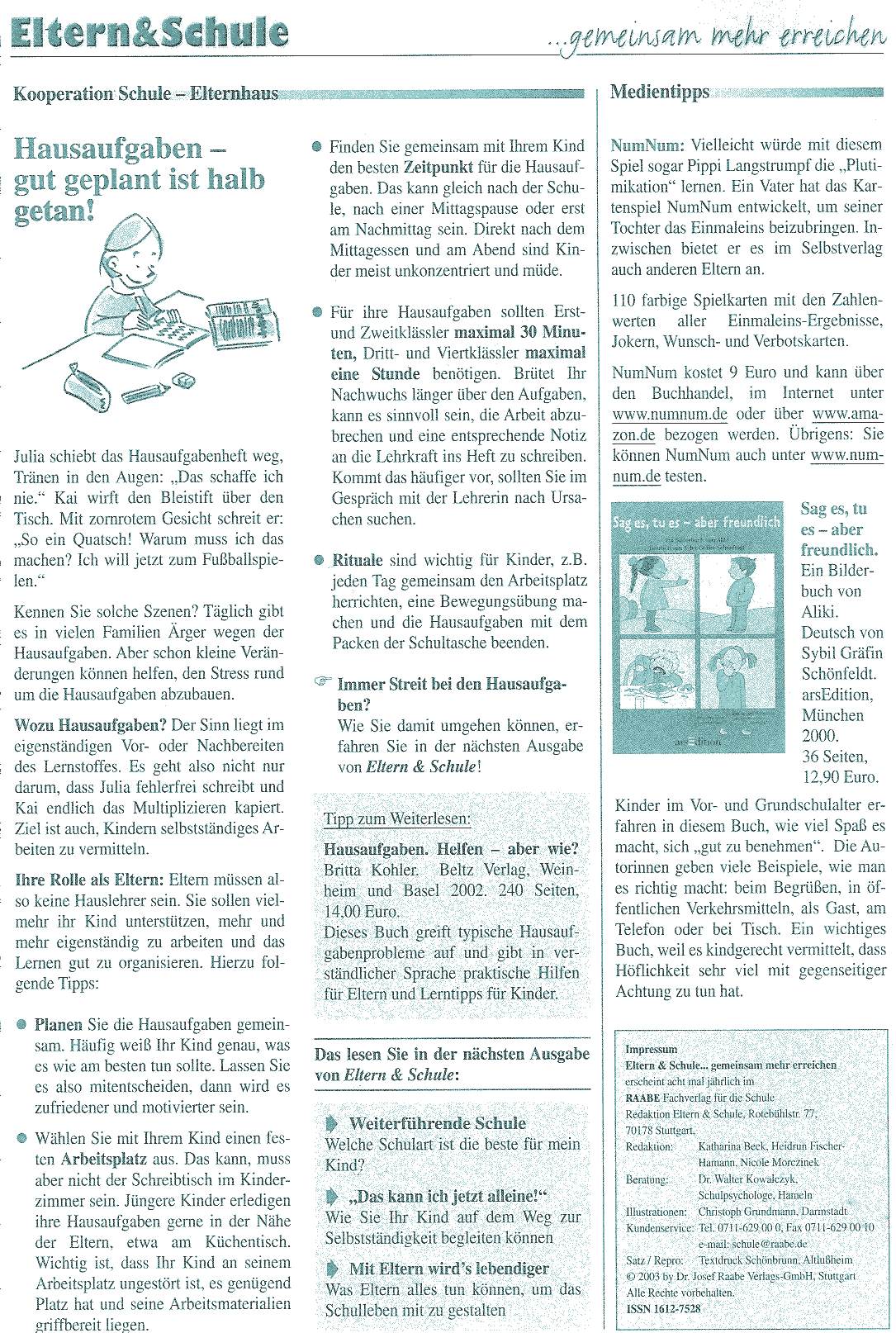 RAABE Fachverlag für die SchuleMedientipp in der Erstausgabe des Newsletters Eltern&SchuleISSN 1612-7528 |