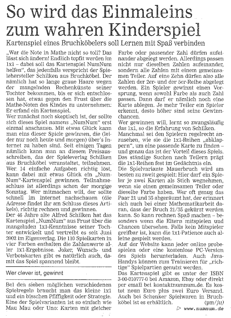 Velber im OZ-Verlag30.10.2003 Im Sonderheft 2003 "Lernen mit Spielen" ist NumNum unter den 66 besten Lernspielen aufgeführt. Leider in der falschen Altersgruppe: |