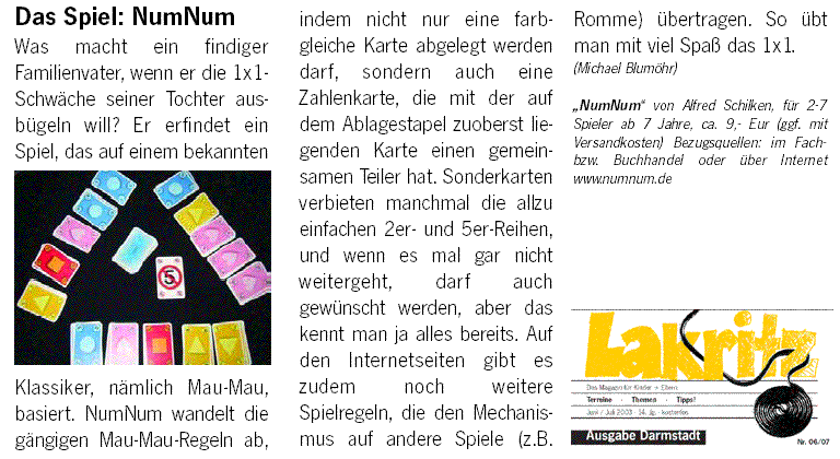 Kindersendung "Pulcinella" Redakteur: Herr Löhlein Zitat: "Ich hab' NumNum mit vielen Kindern schon ausprobiert und ich muß euch sagen, die knobeln da ganz schön rum, fangen an zu rechnen. Darf ich jetzt diese Karte legen oder nicht... Aber nach spätestens drei, vier Partien fällt es einem noch viel leichter: das Einmaleins." |