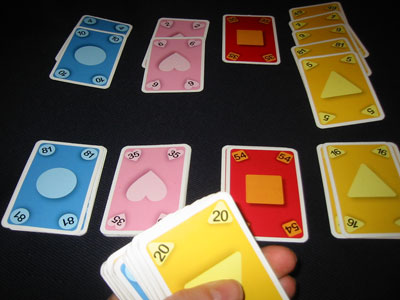 Vom unteren Ende dieser Kartenreihen darf der Spieler jederzeit eine Karte nehmen und auf den Kartenstapel ablegen für den Farbe und Teiler passen. Das darf er auch mehrfach, solange die Karten auf den Stapel passen.
