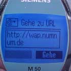 Klick auf "Gehe" Jetzt wird die WAP-Homepage aus dem Internet geholt. Vorsicht! bei neueren Handys muß ein Schrägstrich angehängt werden, also: http://wap.numnum.de/ |