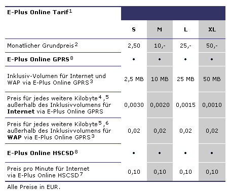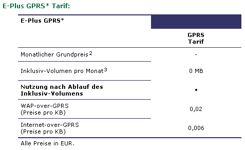 | Für's Kleingedruckte siehe die GPRS-Tarif-Seiten von E-Plus | |