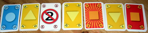 Die 1 - also der Joker - passt auf alle Nummern, auch wenn Verbotskarten aufgedeckt sind. Joker passen doppelt zu allen Karten mit demselben Symbol und 1x zu allen anderen Nummernkarten. |